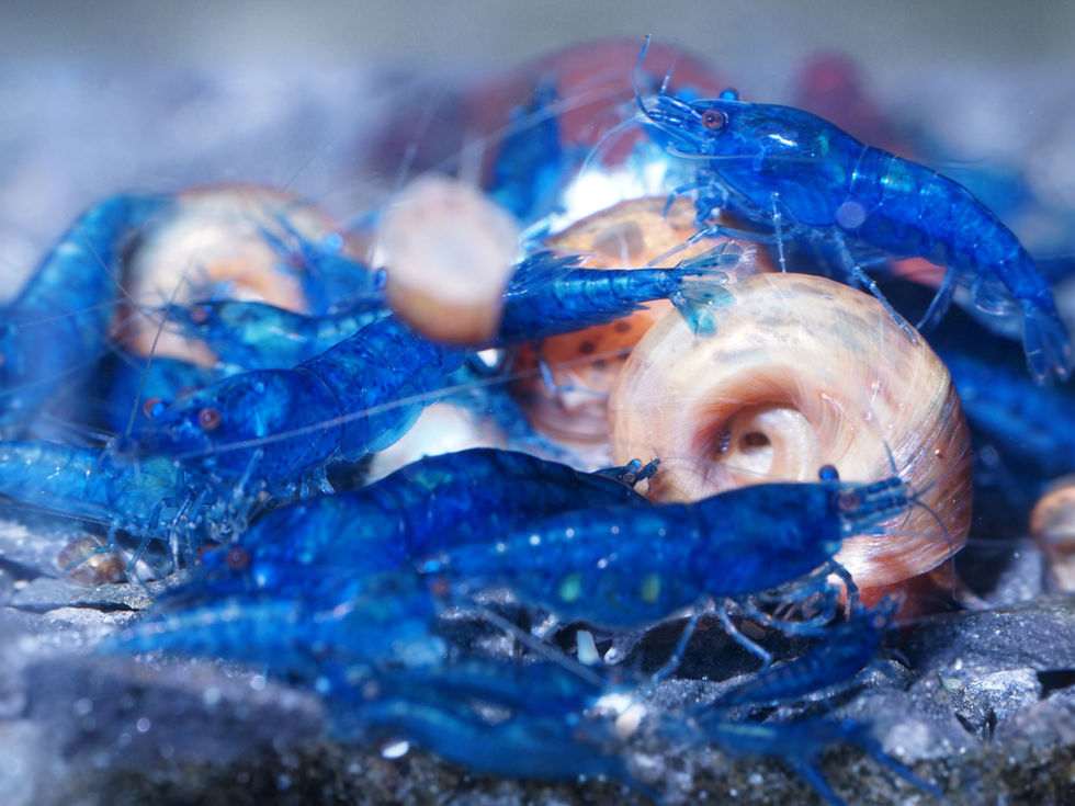 Blue Diamond Garnelen sind friedlich und leben am liebsten in Gruppen ab etwa 10 Tieren. Sie lassen sich problemlos mit anderen Zwerggarnelen, Schnecken und ruhigen, kleinen Fischen vergesellschaften – solange diese keine Jagd auf sie machen.